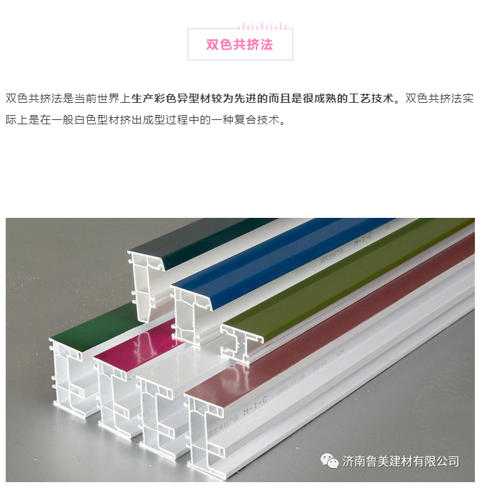 復(fù)合材料一般有彩色有機(jī)玻璃(PMMA)和三元組合物ASA 以及彩色PVC 色母粒三種。雙色共擠法需要增設(shè)共擠機(jī),其中磨具的設(shè)計和制造比較復(fù)雜,且每一種型材就需要一套磨具,一次性投入較高。同時,不合格品和廢品的回收利用也十分困難。此外,不僅需要優(yōu)質(zhì)的耐沖擊型PMMA 粒料,而且需要備用多種顏色。由于這些原因,因此也就限制了其使用和發(fā)展。
